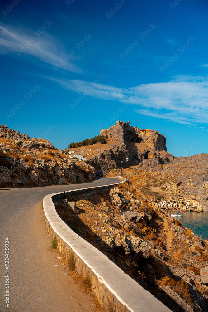 Rock with the Lindo Acropolis in St. Paul's Bay in Rhodes.