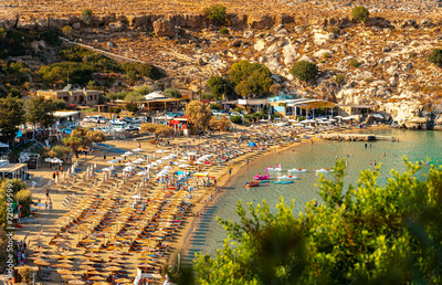 Sunny Lindos beach on the island of Rhodes in Greece.