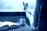 person at home relaxing reading a book enjoying a hot morning cup of tea
