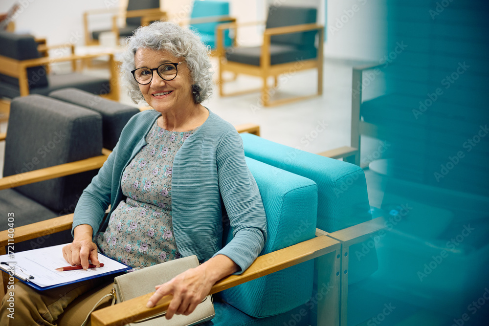 Happy senior woman waiting for doctor's appointment at medical clinic and looking at camera.