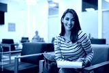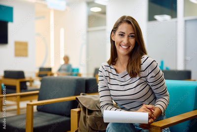 Happy woman filling out medical paperwork in waiting room at doctor's office and looking at camera.