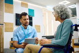 Medical technician using digital tablet while talking to female senior patient at medical clinic.