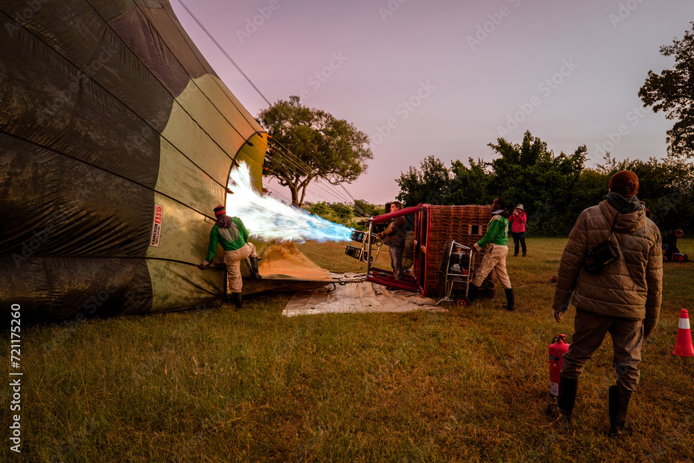 Masai Mara National Reserve, Kenya - March 10 2022: Hot air balloon being hot air filled with flames by a man on a field at sunrise. Close up of a basket and a burner flame, Masai Mara.