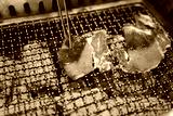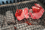 Raw beef slice grilling on fire over charcoal. Japanese style Yakiniku