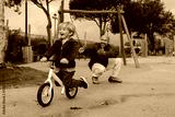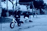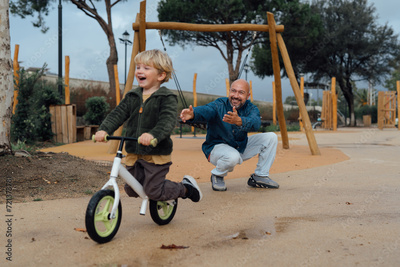 Dad teaches his son riding on bicycle in park. Father and son smile and have fun together