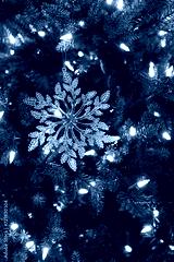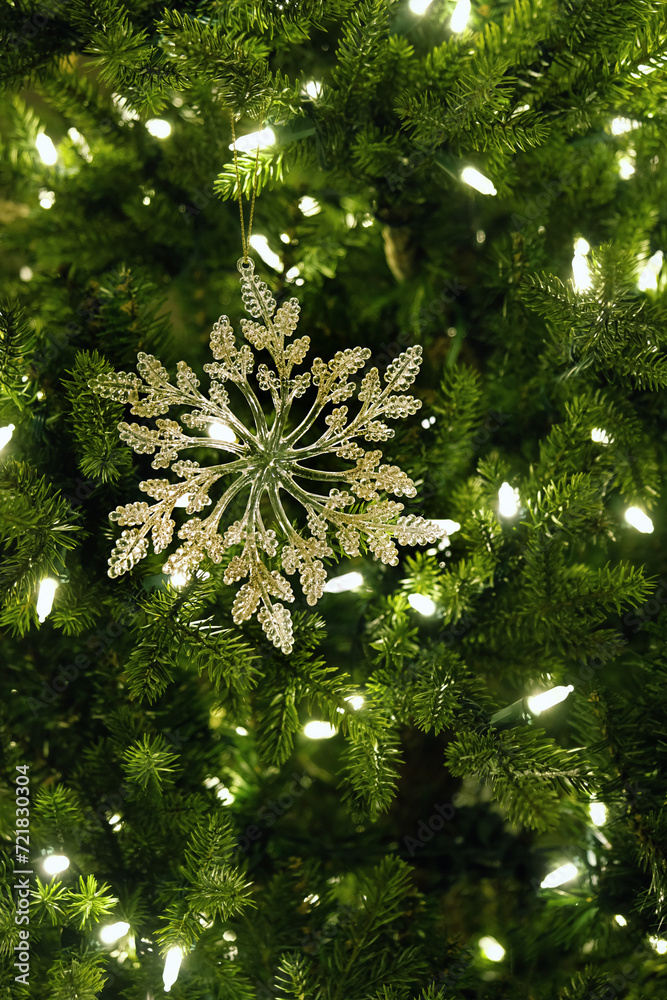 Christmas background. beautiful festive decorative snowflake and garland on christmas tree, abstract backdrop. festive winter season. New Year, Christmas holidays. template for design. copy space