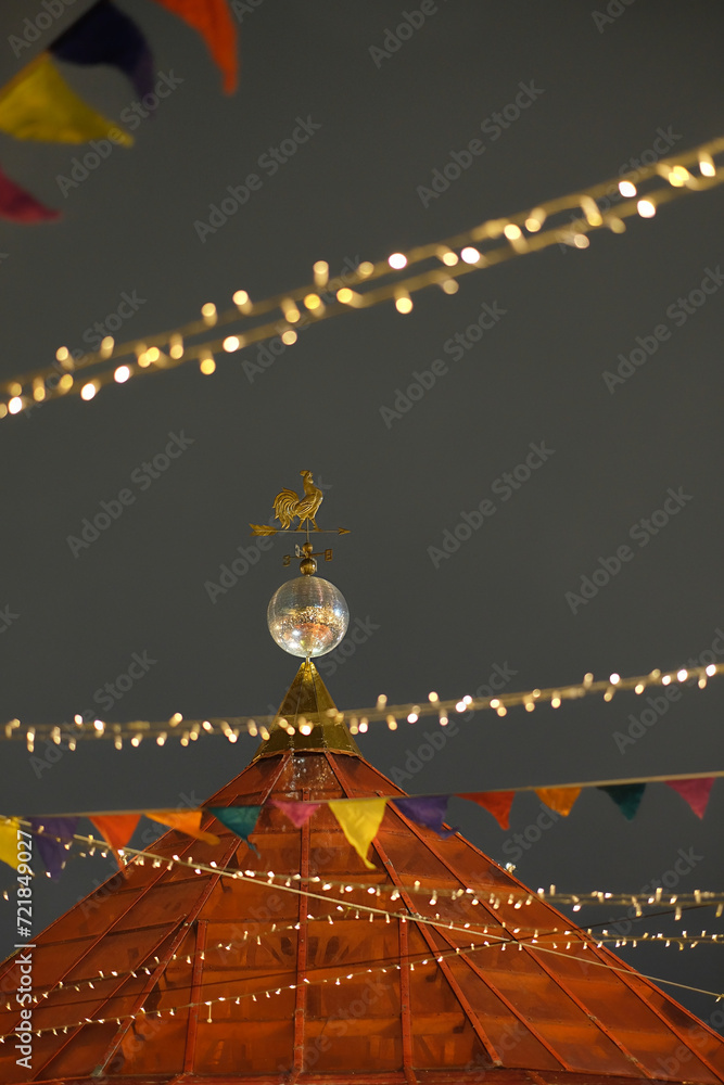 Christmas background. Festive building with evening magic illumination, decorative garlands, colorful flags and cock figurine of roof. Christmas fair outdoor, winter holidays.