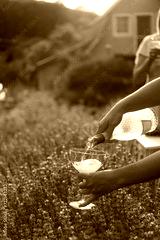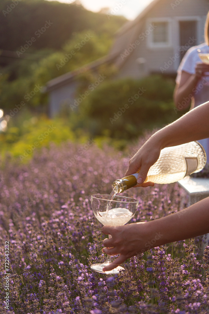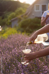 Woman holds glass of white pink champagne decorated with flowers with lavender on the background of a lavender field