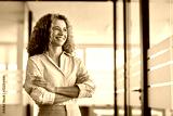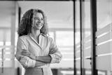 Smiling happy confident old mature professional business woman corporate leader, senior middle aged female executive, lady bank manager standing in office hallway arms crossed looking away, portrait.