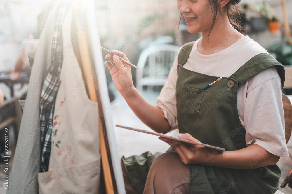 artist, paint, art, drawing, painter, brush, painting, creative, creativity, studio. woman artist painting picture with blank canvas side view, using paintbrush and color palettes having fun create.