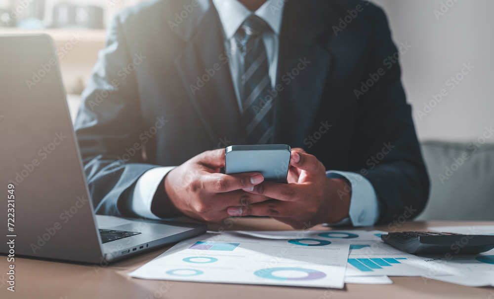 business, finance, investment, financial, document, report, budget, account, accounting, analysis. businessman hands typing something on smartphone sitting at his office. to check point of invest.