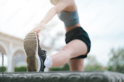 sport, fitness, woman, fit, earphones, exercise, healthy, lifestyle, music, training. sports woman listening to select music on headphones before exercise. woman in sportswear stretching against.