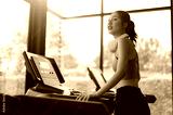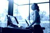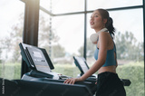 sport, fitness, woman, fit, earphones, exercise, healthy, lifestyle, treadmill, music. side view of young woman running on treadmill and listening to music via headphone during sports training in gym.