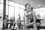 sport, fitness, woman, fit, earphones, dumbbell, exercise, healthy, lifestyle, sportswear. a woman sitting on bench in the gym, streaming audio through headphone while training. workout in gym.