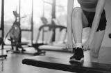 sport, fitness, woman, fit, earphones, dumbbell, exercise, healthy, lifestyle, sportswear. a woman sitting on bench in the gym, streaming audio through headphone while tie shoelaces. workout in gym.