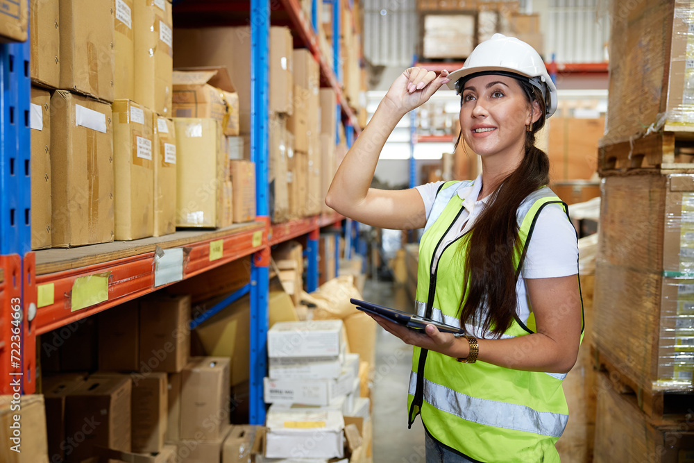 portrait worker working on tablet and looking at cardboard box on shelf in warehouse storage