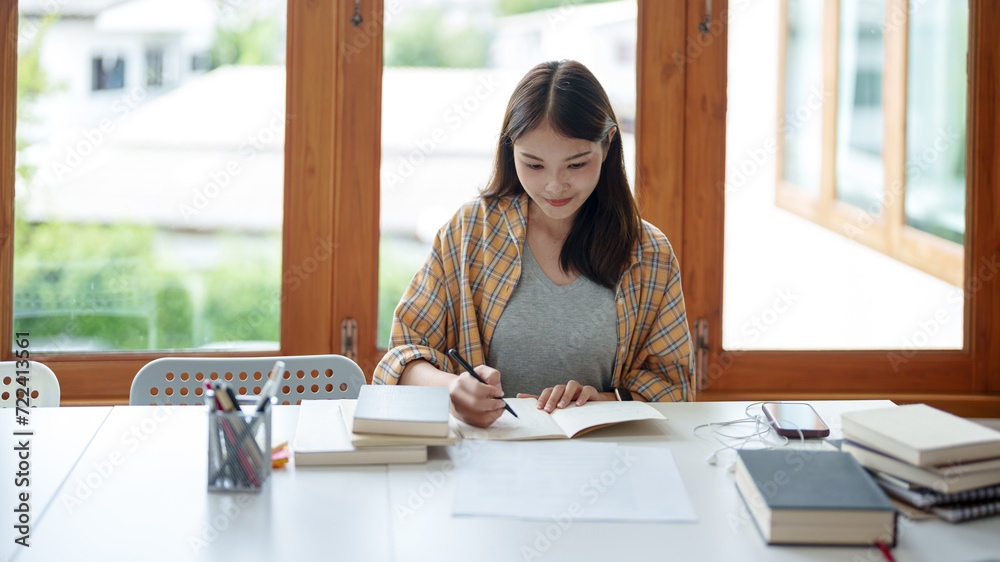 Self learning concept. Young woman student university Researching Book In Library. University Student