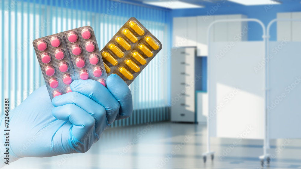 Pills in doctor hands. Blisters with vitamins. Tablets for pain relief. Therapist recommends medicine. Vitamins on background doctor office. Tablets for treatment illness. Pills for immune support