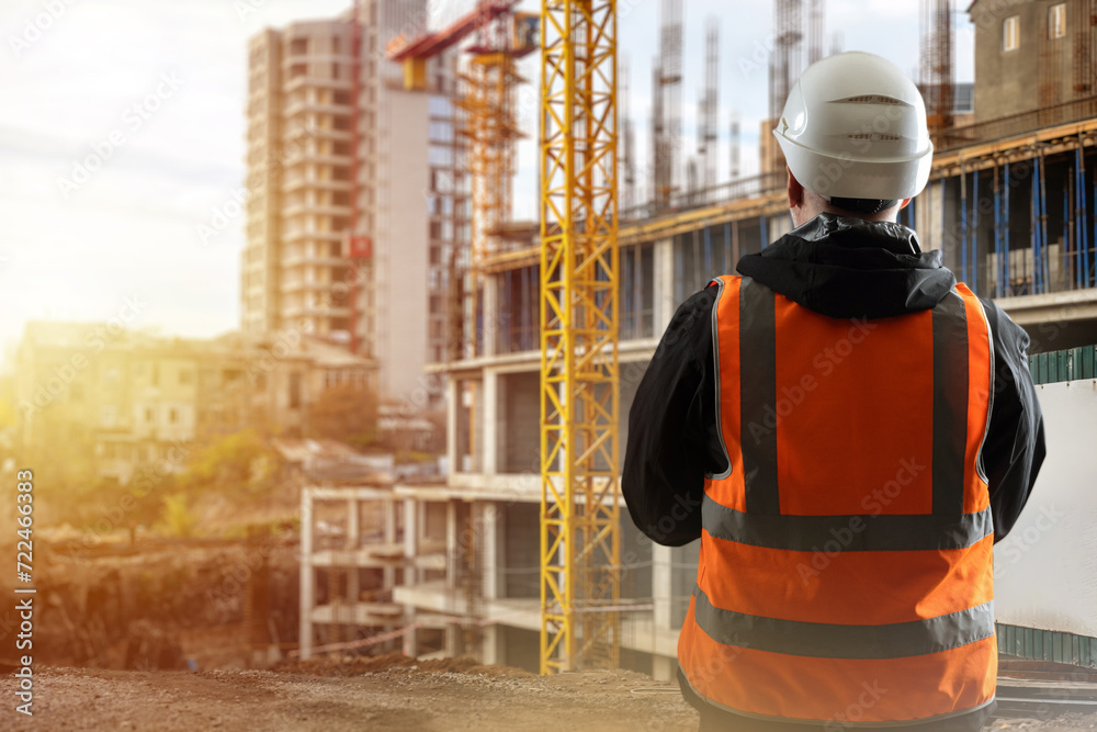 Man builder back to camera. Worker near buildings under construction. Engineer from construction company. Architect oversees erection skyscraper. Builder in orange vest. Man from construction office