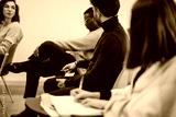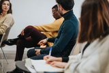 Focused professionals listening attentively in a business workshop, with notes and coworker interaction in a casual office setting.