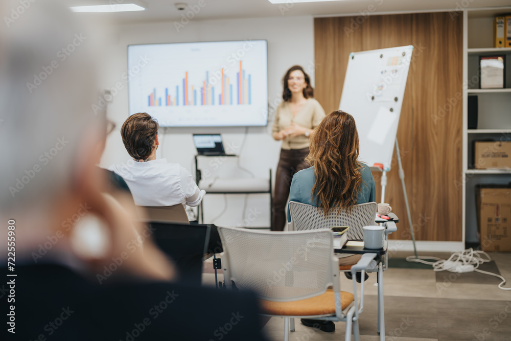 Focused business team engaging with a success-driven female presenter showing bar graphs and statistics on a screen in a modern conference room.