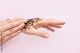 Young woman applies coffee scrub on her hands on pink background, side view.