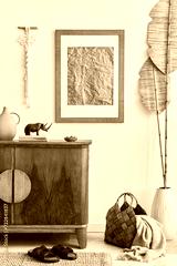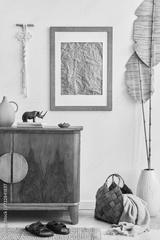 Minimalist composition of living room with brown mock up picture frame, carpet, macrame, dried tropical leaf, decoration and elegant personal accessories in stylish home decor. Template.