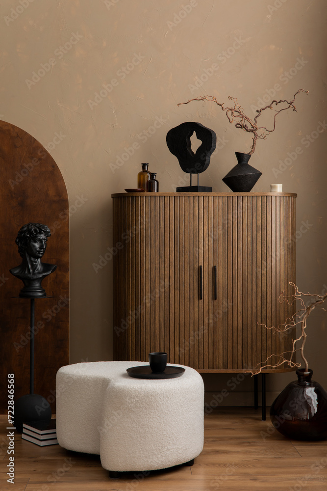 Vertical composition of living room interior with stylish wooden commode, modern pouf, decoration and personal accessories. Template. Home decor.