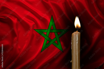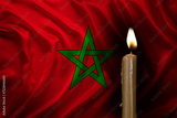mourning candle burning front of flag Morocco, memory of heroes served country, grief over loss, national unity in challenging times, state's history