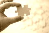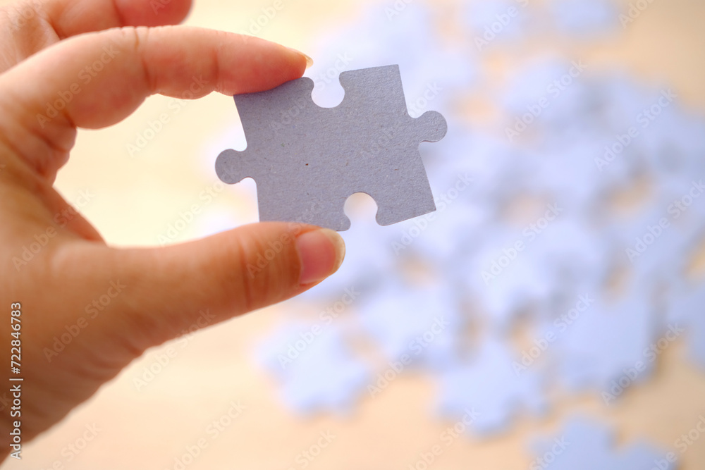 female hand holds cardboard puzzle piece, logical skills, puzzle solving and memory improvement, business concept for completing