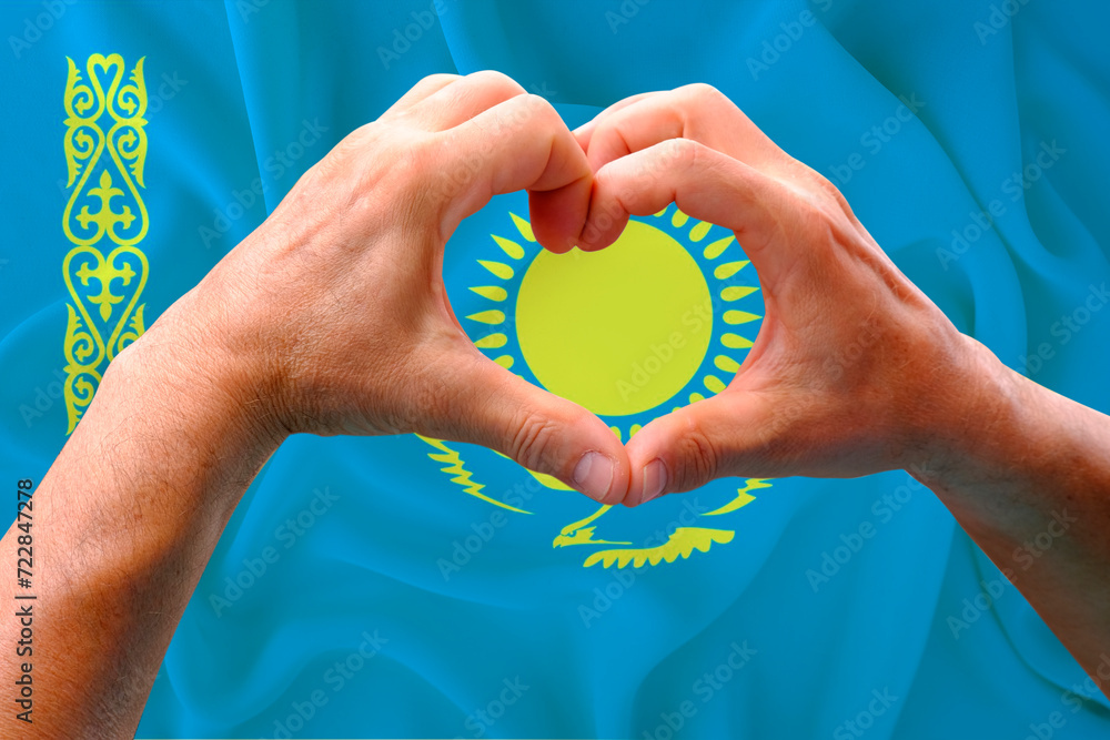 close-up of male hands in heart form against background of silk national flag of Kazakhstan, patriots of country concept, Independence day, travel, international cooperation