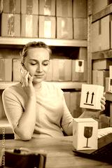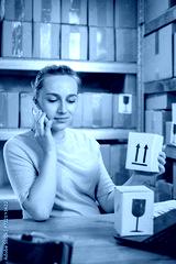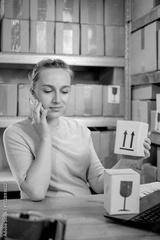 Woman using mobile phone or tablet to communicate with customers. Delivery of goods through private courier companies. Concepts of online sales and online stores