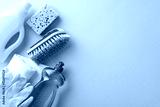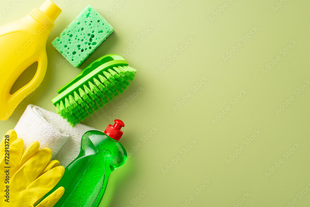 Immaculate Cleaning Scene: Overhead shot of cleaning essentials – detergent bottles, dust rug, rubber gloves, brush, sponge on soft green backdrop. Ideal for promoting cleanliness with space for ads
