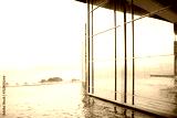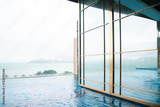 Glass wall of Infinity pool with ocean and mountain range view at luxury resort hotel in Nha Trang, Vietnam, upscale healthy lifestyle, Asia travel destination, relaxation and recreation