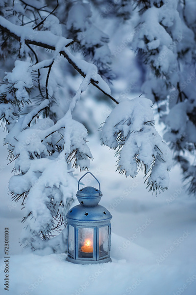 Lantern in snow, snowy pine tree, natural backdrop. winter background. atmosphere festive winter still life. Christmas, new year holidays concept.