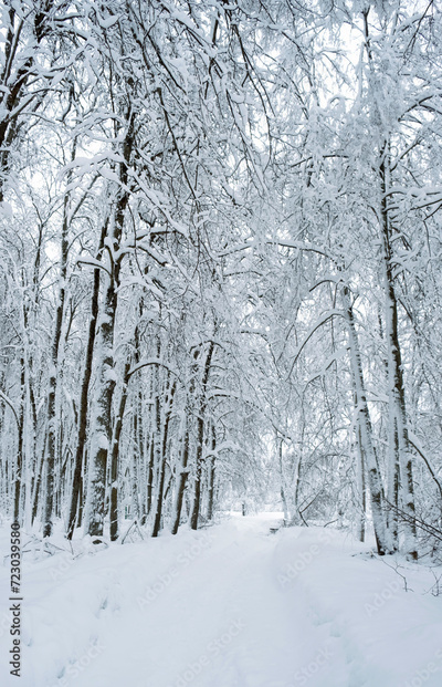 beautiful winter landscape. Frozen snowy trees in forest. Winter nature background. cold frosty weather season. Christmas and New Year time concept.