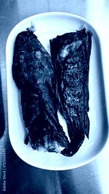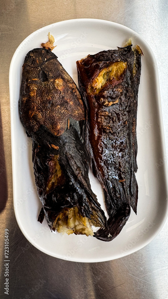Grilled catfish on white plate. Thailand food. Take a photo by smartphone