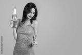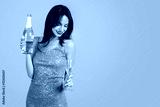 Joyful woman in a glittering silver dress holding a bottle of champagne and a glass