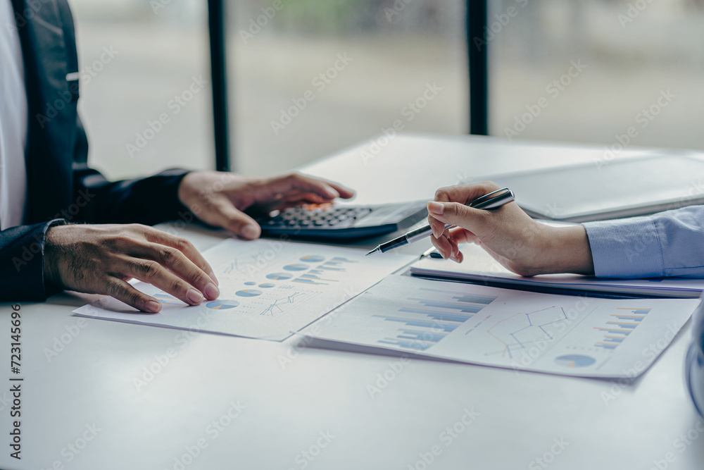 Teamwork with business people analyzing cost graphs on a table at a business conference room and office workers working with project planning documents on a conference table, close-up photography