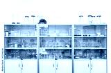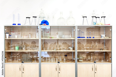 Different laboratory glassware and equipment on shelves.