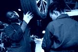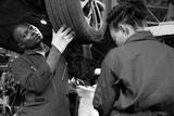 African mechanic workers fixing and checking a car or tire in automobile repair shop
