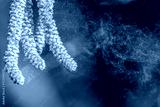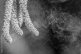 A set of male hazel catkins in dynamic movement, releasing lots of pollen in the wind.