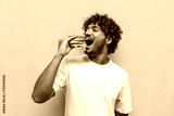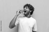 young indian man eating a big tasty burger with his mouth wide open on a yellow isolated background, curly guy student eating and advertising fast food