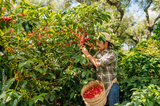 Farmer harvesting coffee on a plantation in Guatemala.