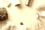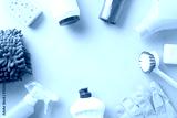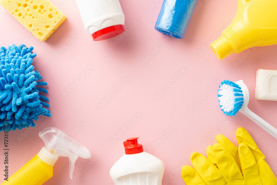 Top view of cleaning must-haves: disinfectant spray, soaps, gloves, duster, and sponge, set against a pale pink background with ample space for your message