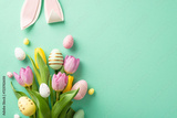 Bursting with Easter charm! Top view snapshot showcasing a mix of tulips and colorful eggs, enhanced with adorable bunny ears. Against a teal setting, providing space for your text or promotion