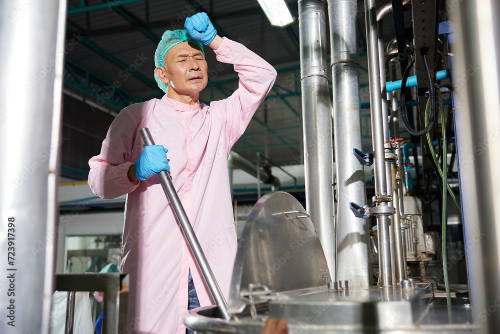 senior worker feeling tired from work beside large industrial pot in the factory