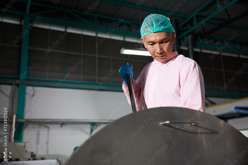 worker stirring water on large industrial pot in the factory