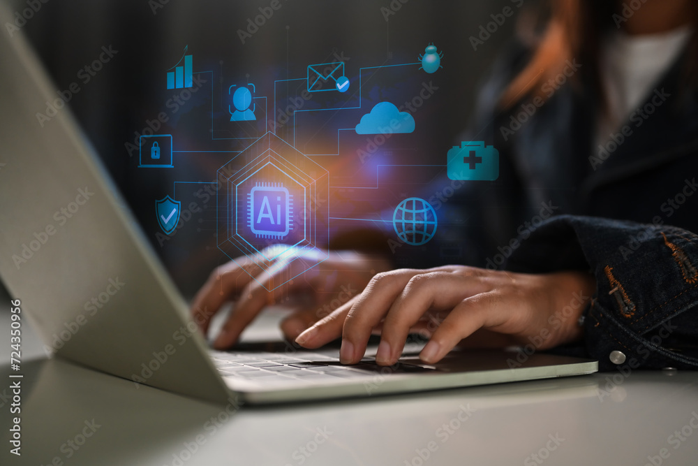 Businesswoman typing on laptop with future virtual icons. Artificial intelligence of futuristic technology concept