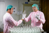 male factory workers checking glass bottles on conveyor in the beverage factory